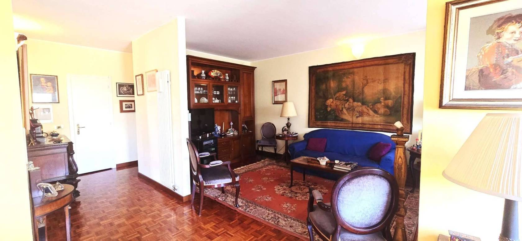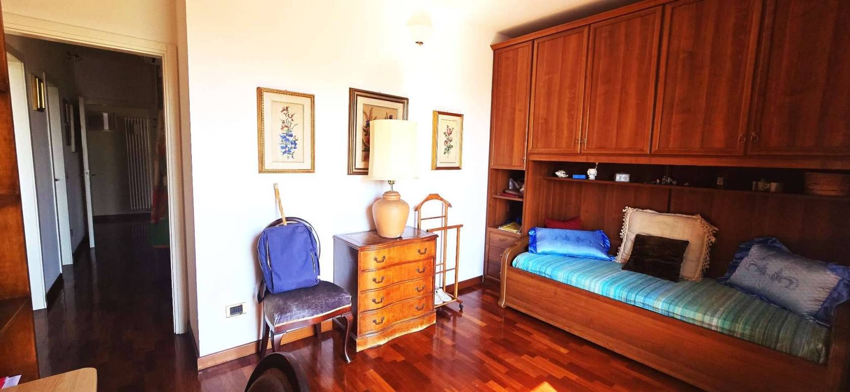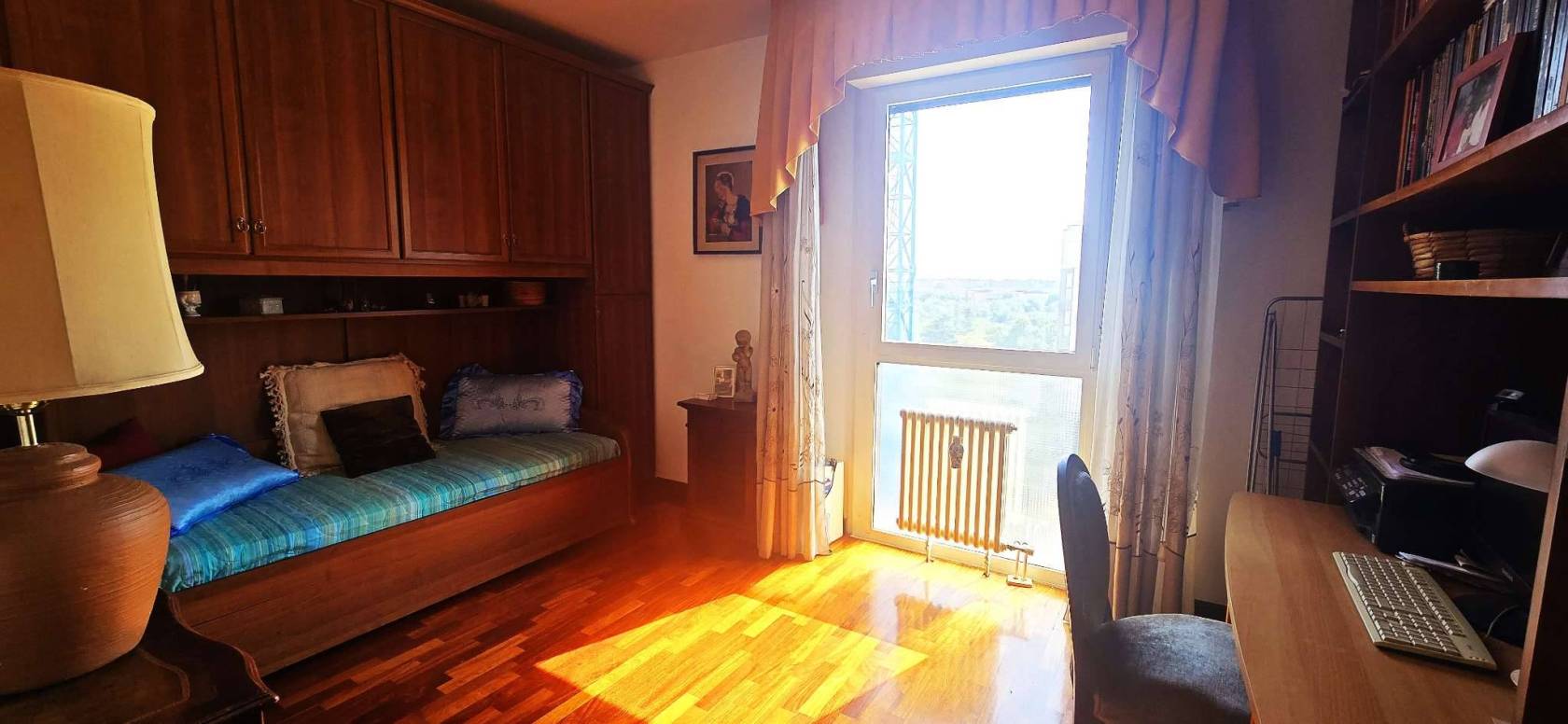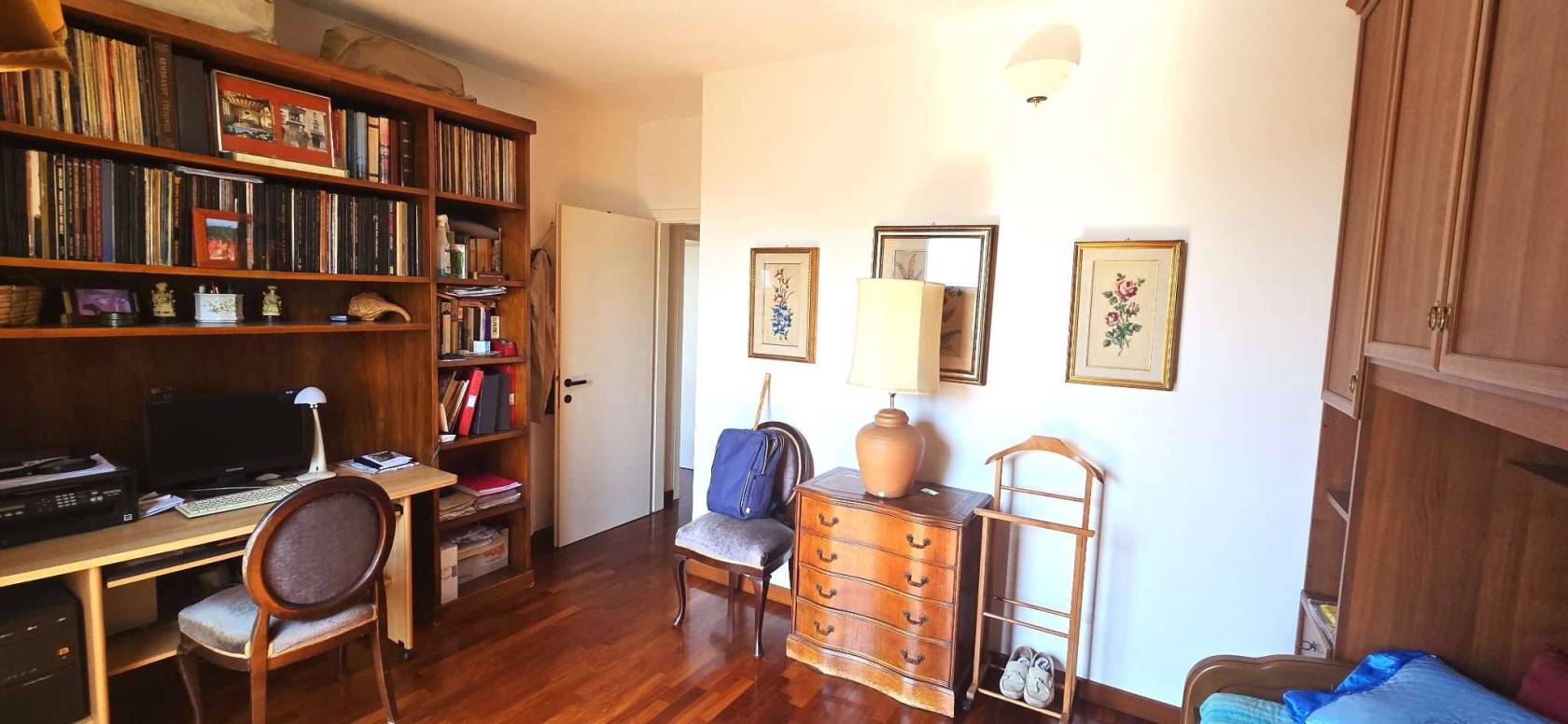 La cucina è separata e abitabile. La zona notte si compone di due camere matrimoniali, due bagni e un ripostiglio. Grazie alla distribuzione interna è possibile ricavare agevolmente una terza camera.