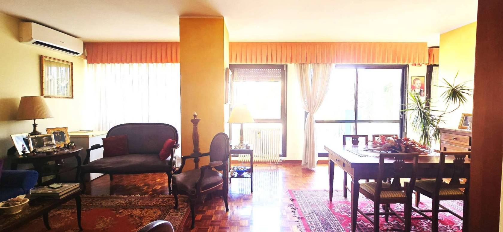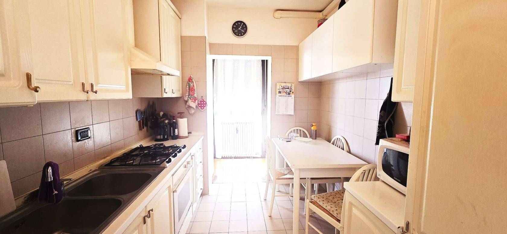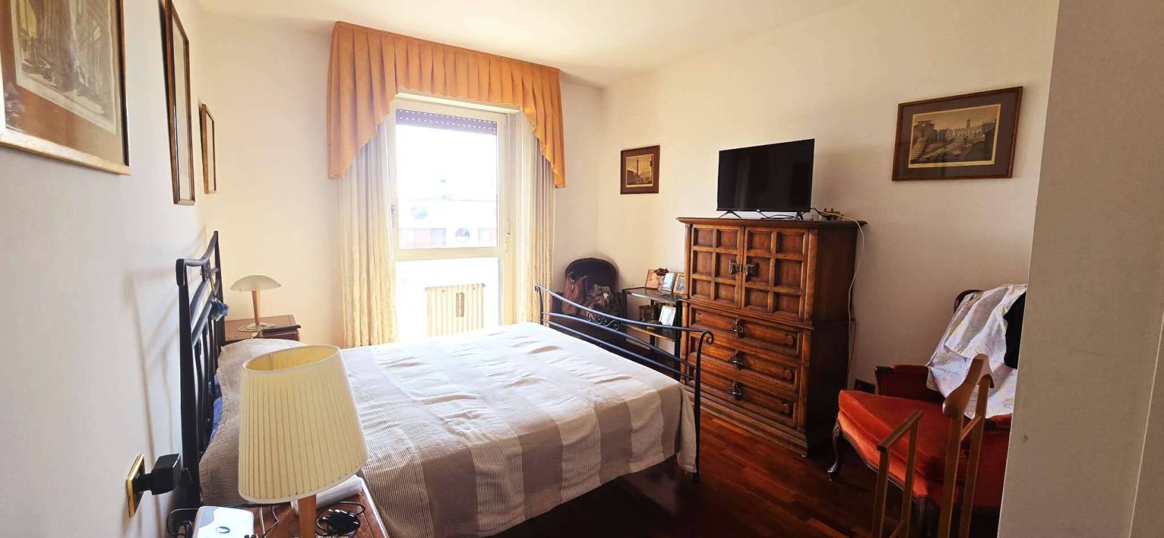 La cucina è separata e abitabile. La zona notte si compone di due camere matrimoniali, due bagni e un ripostiglio. Grazie alla distribuzione interna è possibile ricavare agevolmente una terza camera.